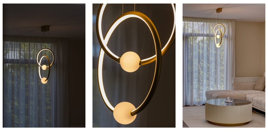Suspensia Liv nu doar că adaugă un element vizual interesant, dar și contribuie la distribuirea uniformă a luminii. Cele două cercuri luminoase adaugă o notă de eleganță și subtilitate, completând armonios întregul ansamblu. Suspensia LIV este ideală pentru un living modern și contemporan. Forma geometrică și finisajele aurii adaugă o notă de lux și rafinament. Poate fi plasată deasupra unei mese de cafea sau în centrul camerei, pentru a crea un punct focal vizual impresionant. Este o alegere excelentă pentru cei care doresc să adauge un element de eleganță și modernitate în designul interior. Indiferent de contextul în care este utilizată, suspensia LIV va transforma orice încăpere într-un spațiu rafinat și plin de personalitate.